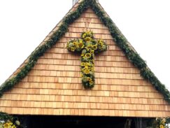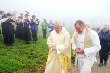 „Auf die Anregung eines Bürgers zum Ende der Chiemgauer Gedenkveranstaltungen kann es aber nur eine Antwort geben: das geschehene Unrecht darf nicht vergessen werden, eben deswegen dürfen wir das Gedenken auch angesichts der aktuellen Geschehnisse in Europa und auf der Welt nicht einstellen, im Gegenteil: Präsenz für den Frieden ist wichtiger denn je“. In diesem Sinne dankte der Bürgermeister den vielen Kräften in seiner Gemeinde, die nach 60 Jahren wieder einmal mit der Gedenk-Organisation zu Füßen der Kampenwand beauftragt worden war. Zugleich war die Ehre des Auftrage ein schöner Bestandteil der heurigen 1.100-Jahr-Feierlichkeiten von Schnaitsee. Der besondere Dank von Thomas Schmidinger galt den Gartenbauvereinen und Veteranenvereinen von Waldhausen und Schnaitsee, den Feuerwehr- und Bergwachtleuten sowie den weiteren Ortsvereinen seiner Gemeinde für ihre Vorbereitungs-, Kapellenschmuck- und Hilfsdienste. Ein weiterer Dank galt den über 60 Fahnenabordnungen, die trotz unsicherer Wetterlage auch bei Regen ausharrten, den vielen Ehrengästen aus Politik, Bundeswehr und Brauchtumspflege, dem Musikverein Schnaitsee (mit über 40 Aktiven) mit ihrem musikalischen Leiter Rupert Schmidhuber, den Schnaitseer Alphornbläsern und den Aschauer Gebirgsschützen für deren Ausgestaltung des Gottesdienstes. Diesen zelebrierte Pfarrer Mario Friedl vom Pfarrverband Schnaitsee-St. Leonhard-Waldhausen zusammen mit Dekan Michael Mannhardt von den Pfarrverbänden Miesbach und Hausham-Agatharied. Pfarrer Friedl sagte auf die nachdenkenswerte Worte von Bürgermeister Schmidinger zu Beginn: „Wollen wir uns bisher vertrauten Menschen anpassen, wenn sie die Vergangenheit ignorieren oder wollen wir uns einer riskanten Auseinandersetzung stellen? Dazu können wir nur antworten, dass wir nicht über Unrecht und Opfer drüberweggehen dürfen und dass wir gegenseitiges Verstehen anstreben sollen“. Ein besonderer Dank an diesem Tag angesichts der ständigen Kapellenpflege galt Franz Schaffner, der mit einer Handvoll von Freunden aus Pittenhart und Höslwang vor kurzem unter anderem für neue Schindeln beim Kapellen-Dach sorgte. Im Sinne der Erbauer und deren Nachfolger kam auch die Kollekte vom Gottesdienst dem weiteren Erhalt der Kapelle zugute.