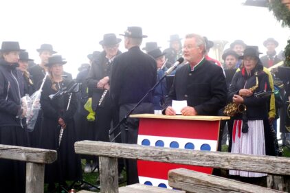 „Wer seine Vergangenheit nicht kennt, der kann auch nicht seine Zukunft gestalten“ – mit diesen Worten stimmt Josef Konhäuser als stellvertretender Landrat von Traunstein bei seinem Grußwort den Anliegen von Bürgermeister und Pfarrer zu. Unter den vielen Ehrengästen waren auch die beiden Landtagsabgeordneten Sebastian Friesinger (CSU) und Sepp Lausch (Freie Wähler). Friesinger sagte am Rande der Veranstaltung: „Wenn wir das Gedenken beenden wollen, dann können wir viel Anderes und Wichtiges für unser Zusammenleben vergessen“. Und MdL Lausch sagte: „Wer wie ich drei Buben hat, die immer näher an ein wehrpflichtiges Alter kommen, der weiß, wie nahe einem persönlich ein Gedenken an Kriege geht!“. Den Abschluss des Gedenk-Gottesdienstes mit der Schubert-Messe bildeten eine Dank-Ansprache von Josef Lutz, dem 1. Vorsitzenden der KSK Schnaitsee sowie eine gemeinsame Kranzniederlegung von Anton Linner, dem 1. Gauvorstand des Chiemgau-Rupertigaus mit Alfons Schuster, dem Vorsitzenden der Interessengemeinschaft der Krieger-, Veteranenvereine und Soldatenkameradschaften im Landkreis Rosenheim. Ehe es festlich zurück zur Einkehr bei der Steinlingalm ging, erklangen das Lied „Ich hatte einen Kameraden“ (mit Salut der Aschauer Gebirgsschützen) und die Bayernhymne.