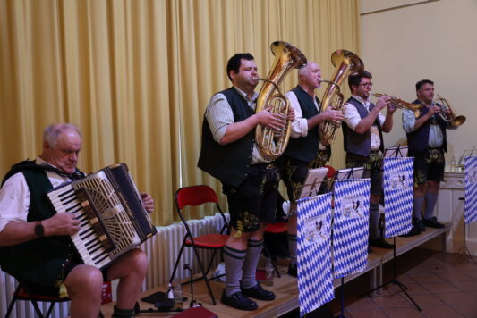 Immer wenn in Berlin Grüne Woche ist, wimmelt es überall in der Stadt von lederbehosten Trachtlern – mit Adlerflaum oder Gamsbart auf dem Hut und „Haferlschuhen“ an den Füßen. Die Chiemgauer Kindsbiermusikanten machten da keine Ausnahme: Samt ihren Instrumenten haben sie sich am 24. Januar 2024 im Bürgertreffpunkt Bahnhof Lichterfelde West (https://www.berlin.de/ba-steglitz-zehlendorf/politik-und-verwaltung/aemter/amt-fuer-soziales/seniorenservice/artikel.929352.php) eingefunden, um den Gästen der beliebten Seniorenfreizeitstätte zünftig aufzuspielen. Bei einer musikalischen Reise durch bayerische Kultur und Lebensart wechselten sich Blasmusik-Ohrwürmer, Landler und Polkas mit hintersinnigen Anekdoten und bayerisch-deftig gewürzten Witzen ab. Eingeladen hatte der Förderverein Bürgertreffpunkt Bahnhof Lichterfelde West e.V. (https://www.lichterfelde-west.net/), dem es dank seines unermüdlichen Engagements immer wieder gelingt, dem guten Ruf des Bürgertreffpunkts als „Kulturbahnhof“ gerecht zu werden.
