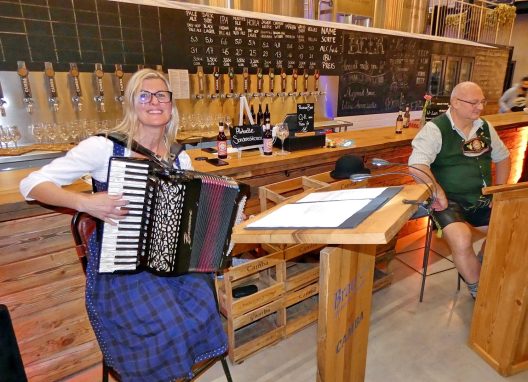Foto (mmü): Musikerin Andrea Wittmann und Bier-Kenner Bernd Schweiger begeisterten mit ihrem bunten „Abend der Sinne“ im Rahmen des Chiemgauer Literaturfests „Leseglück – Grenzenlos Literatur“ in der Brauerei Camba Bavaria in Seeon. Neben Musik und Gesang gab es bayerische Literatur. Für Witz, Humor und Kulinarik war ebenfalls gesorgt.