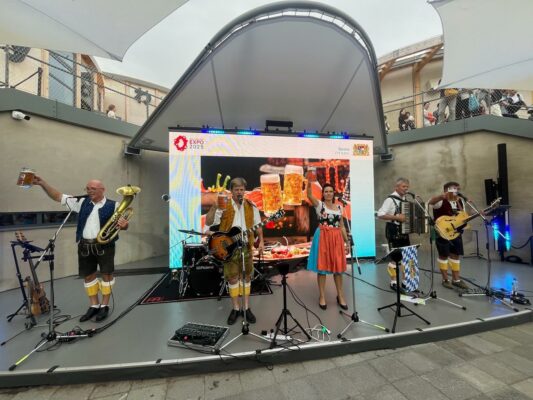 Nach der Ankunft in Japan stand ein Besuch der Mainburger Partnerstadt mit der Asahi-Brauerei auf dem Programm, wo selbstverständlich auch ein zünftiges Konzert gegeben wurde. Der zweite Auftritt führte die Musiker zu einem gemeinsamen Frühschoppen mit den Tokio Spitzbuam in die Yokohama Brewery. Beide Gruppen wechselten sich ab und spielten zum Abschluss gemeinsam auf. Besonderen Anklang fand dabei die Polonaise mit dem gesamten Publikum, gemeinsames Schunkeln und das Singen des „Prosit“ und „Oans, zwoa, g’suffa“. Auch das deutsch-japanische Lied „Konnichiwa“ von AndiSan (Andi Starek) durfte nicht fehlen. Ein weiterer Höhepunkt war das offizielle Anzapfen des ersten Bierfasses auf der Expo durch Staatssekretär Tobias Gotthardt vom Bayerischen Wirtschaftsministerium, standesgemäß in Oberpfälzer Tracht und mit nur zwei Schlägen. Das Bier stammte vom Tegernseer Braumeister Stephan Rager, der am Fuße des Mount Fuji eine eigene Brauerei betreibt – selbstverständlich nach dem Deutschen Reinheitsgebot.