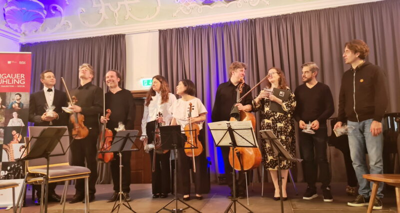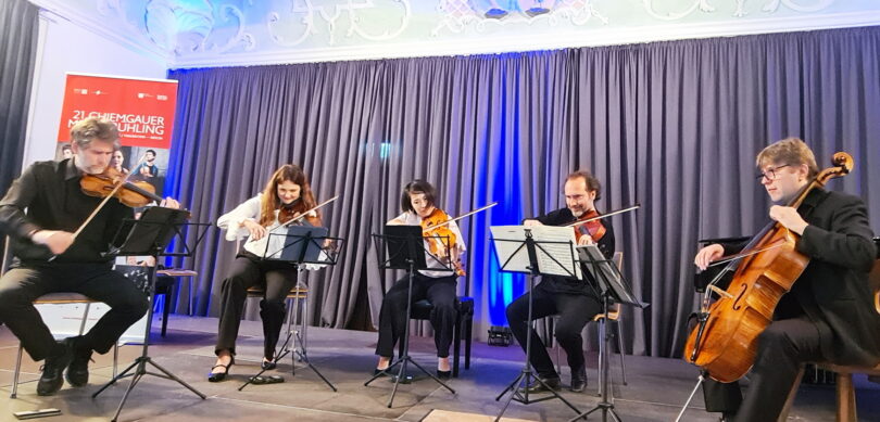Bericht und Fotos: Christiane Giesen – Bei „Nacht und träume“ des 21. Chiemgauer Musikfrühlings im Festsaal von Kloster Seeon spielten im Streichquintett von Felix Mendelssohn (von links) Nicolas Dautricourt, Tatiana Samouil, beide Violine, Razvan Popovici und Tomoko Akasaka, beide Viola, sowie Thomas Carroll, Violoncello.