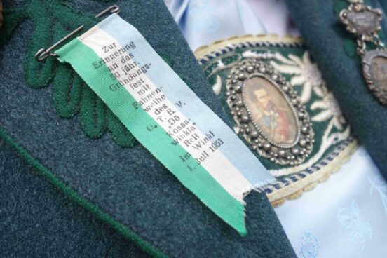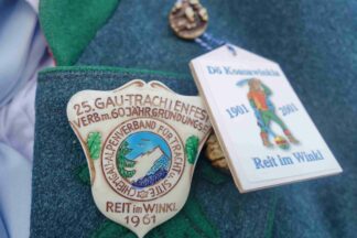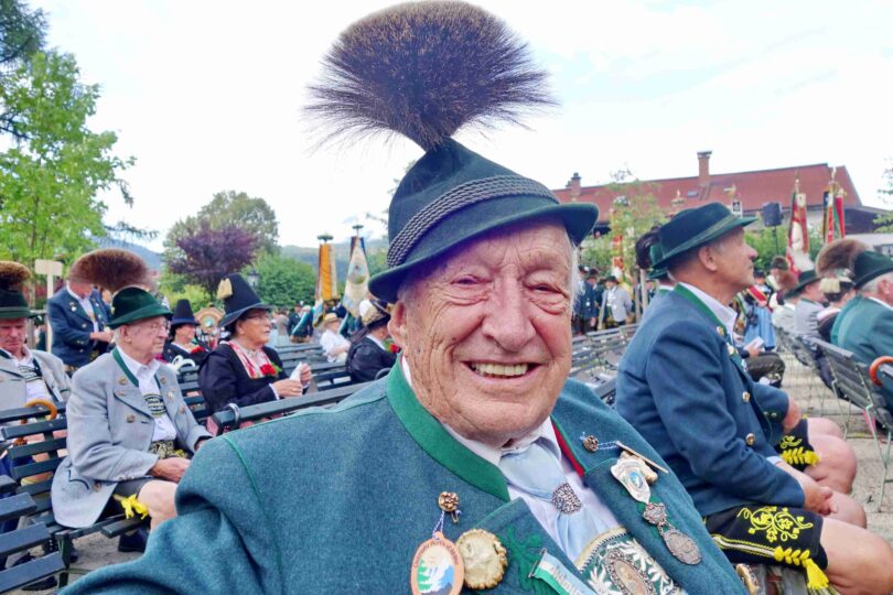 In Reit im Winkl war der 91jährige Trachtler zum 5. Male bei einem Gaufest dabei. Das erste Mal 1951 – so erinnert er sich – kam er aus München mit zwei weiteren Trachtenkameraden seines Vereins mit dem Fahrrad nach Reit im Winkl. Die weiteren Gaufestjahre in Reit im Winkl waren 1961, 1981, 2001 und eben heuer, dieses Fest wurde wegen Corona zwei Jahre später als ursprünglich geplant gefeiert. Vor dem Feldgottesdienst konnten wir mit Erich Hagner über seine Treue zum Chiemgau und zur Chiemgauer Tracht sprechen und die von ihm mitgebrachten Festzeichen der vormaligen Reit im Winkler Gautrachtenfeste anschauen. Inzwischen ist er bei allen Gautrachtenfesten seit 74 Jahren dabei, dazu kann er ergänzen: „Nach Bernau machten wir einen Zwei-Tages-Bus-Ausflug, die Übernachtungen fanden privat statt und es gab noch gestrenge Regeln“. Damit meinte er zum Beispiel, dass laut Festbestimmungen das Jodeln, Schreien und Juchzen während des Kirchenzuges zu unterlassen war. Auf die Frage, wie es zu einem Chiemgauer Trachtenverein in München gekommen ist, weiß Hagner zu berichten: „Die Gründung erfolgte bereits 1894, also zehn Jahre nachdem der erste Chiemgauer Trachtenverein in Hohenaschau gegründet wurde und ein Jahr bevor unser Patenverein Prien a. Chiemsee entstand. Unsere Gründungsmitglieder waren vorwiegend Männer, die sich aus beruflichen Notwendigkeiten in die Großstadt begaben und dort gemeinsam ihre heimatlichen Bräuche weiterpflegen wollten“.