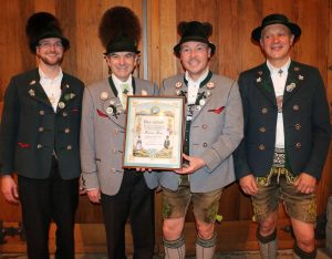 Für seine Verdienste um die Trachtensache und seine langjährige aktive Arbeit in der Vorstandschaft des Trachtenvereins „Griabinga“ Hohenaschau wurde Herbert Reiter (zweiter von rechts) mit dem selten verliehenen Gauverdienstzeichen des Chiemgau-Alpenverbands in Gold ausgezeichnet. Der erste Vorsitzende des Chiemgau-Alpenverbands Miche Huber (rechts) und seine beiden Stellvertreter Franz Fischer (links) und Georg Westner (zweiter von links) überreichten dem Geehrten die Urkunde als Anerkennung für seine außerordentlichen Verdienste um die Trachtensache.