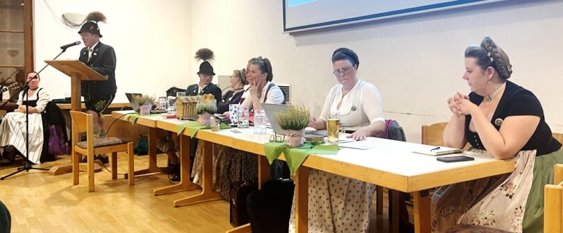 Wenn 2026 der Gauverband 100 Jahre alt und das Gautrachtenfest in Marquartstein gefeiert wird, dann wird es auch eine umfangreiche Chronik geben. Federführend hierbei ist Gaustandartenträger Christian Härtl vom Trachtenverein Chiemgauer München. „Inzwischen sind bereits 1.000 Arbeitsstunden entstanden, die Arbeit macht richtig Spaß und die Vereine machen mit. Gesucht wird im Rahmen eines Wettbewerbs noch ein Foto für die Rückseite“ – so Christian Härtl. Erfreulich war auch der Bericht von Preisrichterobmann Lorenz Mühlberger aus Reit im Winkl, er gab bekannt, dass sich elf neue Preisrichter und erstmals vier Dirndl für das Amt der Bewertungen bei Preisplatteln und Dirndldrahn gefunden haben. Für Gaukassier Klaus Weisser aus Staudach stellte seine Stellvertreterin Annemarie Lackerschmid ein umfangreiches Zahlenwerk vor, das trotz hoher Ausgaben von den Revisoren Klaus Zaisberger aus Grassau und Maria Höhne aus Amerang für bestens in Ordnung befunden wurde. Gauvorstand Thomas Hiendl informierte ausführlich über bayernweite Themen wie Messerverbot, Bairische Sprache, Mitgliederentwicklung sowie Heimat- und Trachtenboten, zudem bekam er Zustimmung für eine Aktualisierung der Satzung. Für die Jahre 2028 bis 2033 wird es nach ersten Kenntnissen der Vorstandschaft mehrere Vereine als Bewerber für ein Gautrachtenfest geben, deshalb soll im Frühjahr 2028 zur Sondierung mit allen betroffenen Vereinen eine Zusammenkunft zur Aussprache angesetzt werden. Die Frühjahrsversammlung 2025 wurde für den 24. April an den Trachtenverein „Daxenwinkler“ Atzing vergeben, für die Herbstversammlung 2025 wird noch ein Gastgeber gesucht. Abschließend bedankte sich Zweite Gauvorständin Lisbeth Tengler bei Thomas Hiendl für die angenehme Verbandsführung und bei der ganzen Gauvorstandschaft für das ganzjährige und gute Miteinander. Ein weiterer Dank galt den Ehrenamtlichen des Greimhartinger Trachtenvereins für deren Bewirtung im Gemeindehaus. Über die, viele Freudenjuchzer auslösende Vergabe des Gautrachtenfestes 2027 nach Greimharting in der Gemeinde Rimsting und über Ehrungen berichten wir noch gesondert.