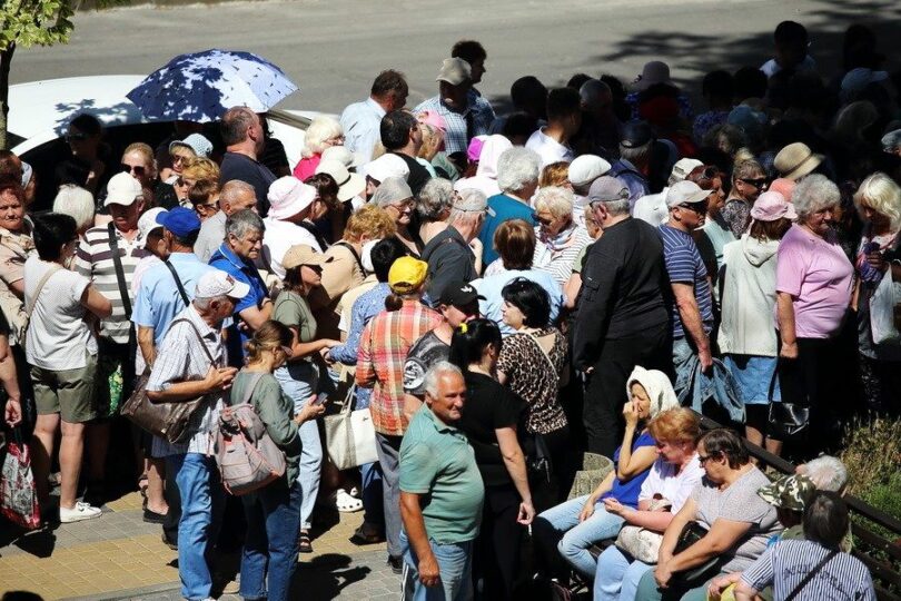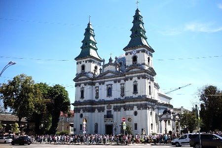 Foto: Essenspaket-Ausgabe, 2 x im Monat rund um die Kathedrale in Ternobil