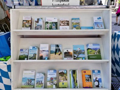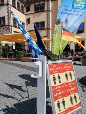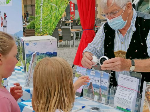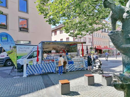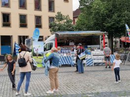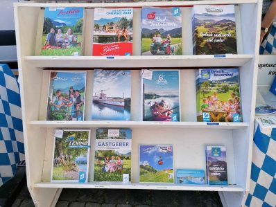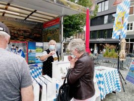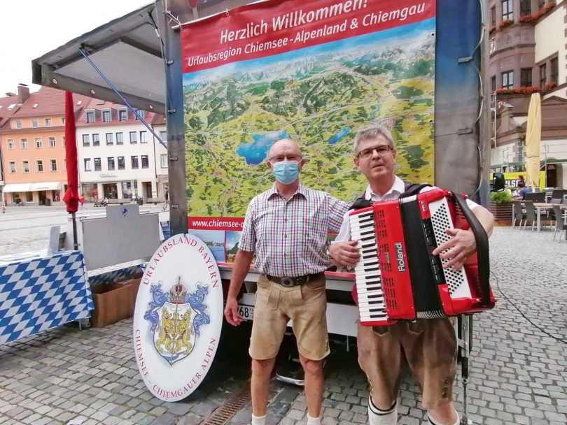 „Endlich konnten wir wieder los legen. Bei angenehmen Temperaturen, mit Corona-Abstandsplakaten, Desinfektionsstation und Gesichtsmasken bauten wir unseren weiß-blauen Urlaubs-Truck auf dem großen Marktplatz vor dem Rathaus in Schweinfurt auf. Nordbayern ist für unsere Ferienregion ein wichtiges Quellgebiet. Darum sind wir öfter dort unterwegs. Auch diesmal war der Zuspruch der Interessenten wie gewohnt sehr rege. An den nur an die weiblichen Besucher verteilten Überseer Schokoladenherzen lässt sich ganz gut ablesen, wie stark die Nachfrage am Stand ist. Am Donnerstag Mittag waren schon die ersten 100 weg! Mit den Tragetaschen war es ähnlich. Unter dem Strich war es so, dass die mitgeführten Rad- und Wanderkarten und -Broschüren gerade so bis Samstag reichten, bevor uns ein finales Gewitter ein unerwartet feuchtes Ende des Werbeeinsatzes bescherte. Bis dahin sorgte unser Musiker-Schorsch aus Eggstätt fleißig für musikalische Unterhaltung und auch Peter Kreitmeier aus Oberaudorf leistete mit seinem barocken Charme und seinem fundierten touristischen Erfahrungsschatz wertvolle Werbearbeit. Teilweise war es schon anstrengend – und vor allem warm. Aber der kleine Beitrag zum Marketing für unsere reizvolle Region hat auch wieder Spass gemacht!“