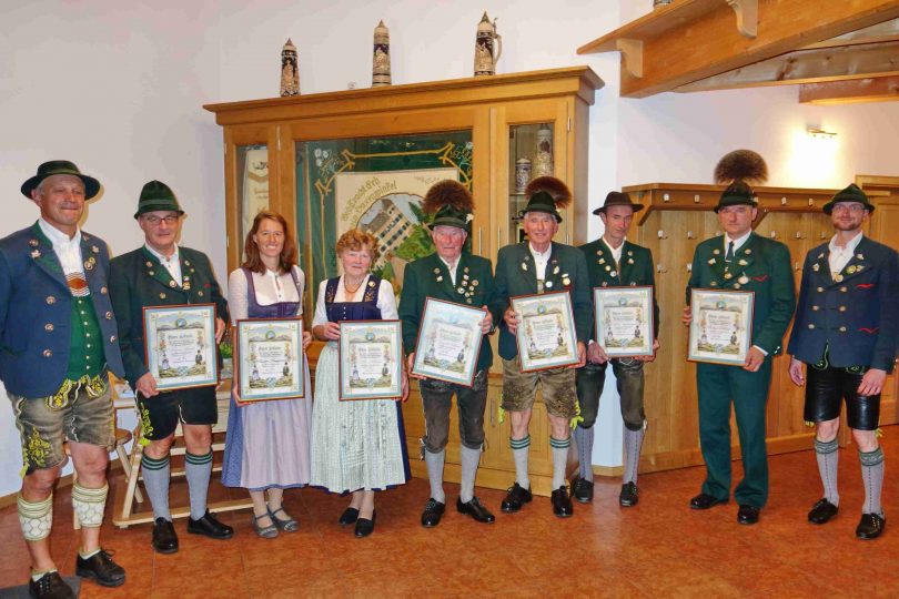25 Jahre Mitarbeit in der Vereins-Vorstandschaft sind Voraussetzung für das Silberne Gauverdienstzeichen. Dieses erhielten Florian Rauch (Kassier und Mitglied im Jugendleiterteam), Albert Niedermayer (stellvertretender Vorstand), Michael Schlosser senior (Fähnrich, Bauleiter Vereinshaus), Christine Langmann (Jugendleitung, Kassenführerin) sowie Leopold Schlosser senior ( Fähnrich, 2. Vorstand und Beisitzer).