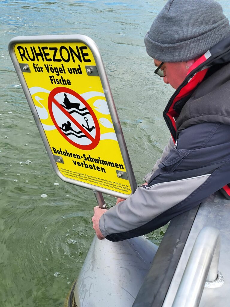 Schließlich sind alle Bojen bestückt. Wer sich nähert, kann lesen, dass hier eine Ruhezone beginnt. Befahren und Schwimmen sind verboten – gemäß einer Verordnung der beiden Landratsämter Traunstein und Rosenheim. Im Spätherbst erst werden Enzinger und Jackel hinausfahren und die Schilder abmontieren. Schilder rauf, Schilder runter: Für die beiden ist das eigentlich Routine. Seit mehr als zwei Jahrzehnten schon führen sie diese Arbeit gewissenhaft aus. Und doch ist die Fahrt diesmal etwas Besonderes.