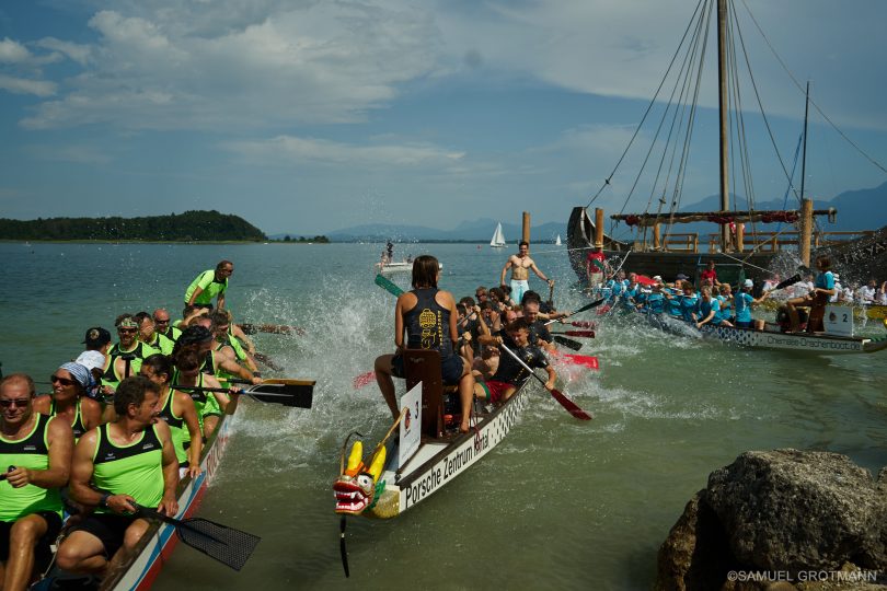 Veranstaltungsort Prien – „Der Badeplatz Schraml mit großer Liegewiese, Kiosk und Lounge-Terrasse ist die perfekte Eventlocation für das Drachenbootrennen“, erklärt der Veranstalter Dirk Lux von outdoorLUX. „Am Badestrand sind die Zuschauer hautnah dran am Renngeschehen – eine Garantie für beste Stimmung. Primär sind lokale Freizeitteams am Start. Letztes Jahr waren aber auch Teilnehmer aus Italien am Start, die die Atmosphäre am Chiemsee lieben.“