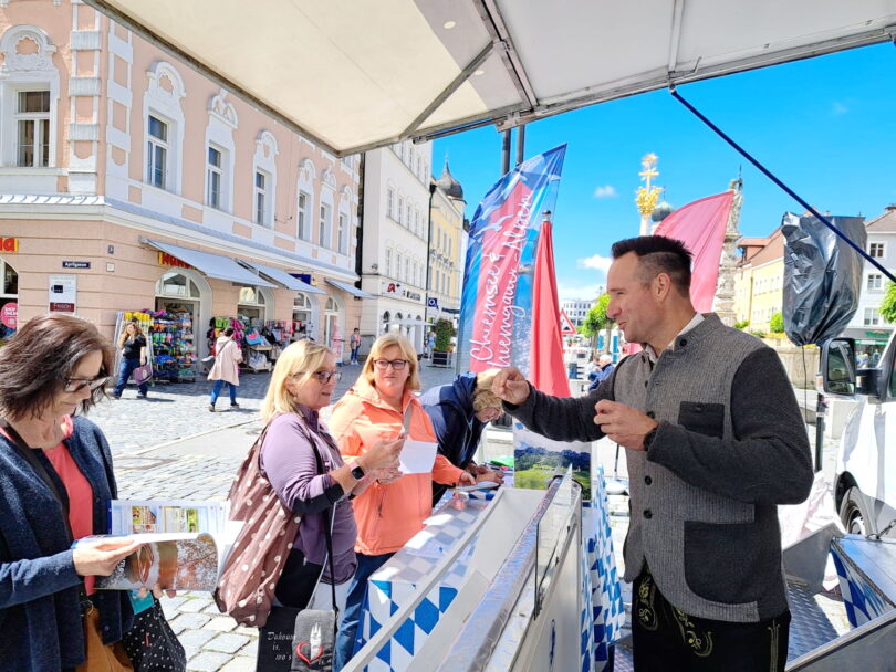 Bei dem dreitägigen Promotion-Einsatz in der Innenstadt von Straubing wurde die Marktgemeinde Prien a. Chiemsee von dem Leiter des Tourismusbüros, Florian Tatzel, vertreten. Gemeinsam mit dem Organisator der Werbefahrten, Wolfgang Bude, informierte Tatzel zahlreiche Passanten über die Urlaubsregion Chiemsee-Alpenland. Der Zuspruch am Stand war großartig: freudig ergriffen die Besucherinnen und Besucher ihre Chance auf einen Kurzurlaub bei dem Gewinnspiel und nahmen Prospekte – überwiegend zu den Themen Radfahren, Wandern und Camping – sowie kleine Werbegeschenke entgegen. Lediglich das teils kühle und regnerische Wetter ließ einige Wermutstropfen auf den „Urlaubs-Truck“-Einsatz am Theresienplatz fallen. „Dass die Straubinger Standbesucher so extrem begeistert von unserer Region sind, war sehr motivierend“, freut sich der Leiter des Priener Tourismusbüros. „Nicht nur die Verbundenheit durch einen ähnlichen Dialekt, sondern vor allem die Aufgeschlossenheit der Besucherinnen und Besucher, ihre Wissbegier und die vorherrschende Kenntnis unseres Urlaubsgebietes, vermittelten uns den Eindruck, dass die Kunden der Information auch ‚Taten‘ folgen lassen und immer wieder ein Wochenende oder ein paar Tage in unsere Region verbringen.“