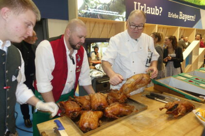 Neben den werbewirksamen Darbietungen von Musikanten und Trachtlern aus den Reihen des Bayerischen Trachtenverbandes und den kulinarischen Spezialitäten des Entenwirtes im Bayernhallen-Biergarten fanden vor allem die Tourismus-Angebote am Rosenheimer Aussteller-Gemeinschaftsstand den Gefallen der Besucher. „Besonders interessiert zeigten sich die Berliner und die Messegäste über alle Formen der Freizeit- und Übernachtungsangebote in unserem Chiemsee-Alpenland“ – so Astrid von Rauhecker. Und Ute Preibisch ergänzte: „Auffällig war vor allem, dass ganz gezielte Wünsche geäußert wurden und dass ganz bewusst das Prospekt- und Kartenmaterial mitgenommen worden sind“. Für Entenwirt Peter Schrödl vom Samerberg und seinem Team war die Grüne Woche insgesamt eine interessante Herausforderung, letztlich erfreuten sich wieder Tausende von Besuchern an den aus der Heimat mitgebrachten bayerischen Schmankerln und am freundlichen Service der Bedienungen. Insgesamt fast 50 Leute waren für den Entenwirt nach Berlin gefahren und im Einsatz für zehn Messetage und für zwei Abend-Empfänge des Bayerischen Landwirtschaftsministeriums und der Messe Berlin.