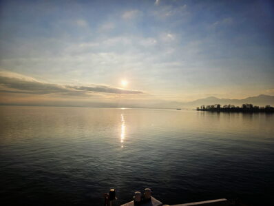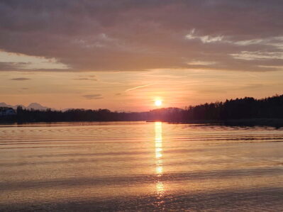 Gerade in diesen sonnigen Februartagen präsentiert sich der Chiemsee mit der aufgehenden und mit der untergehenden Sonne im abwechselnd schönen Licht.
