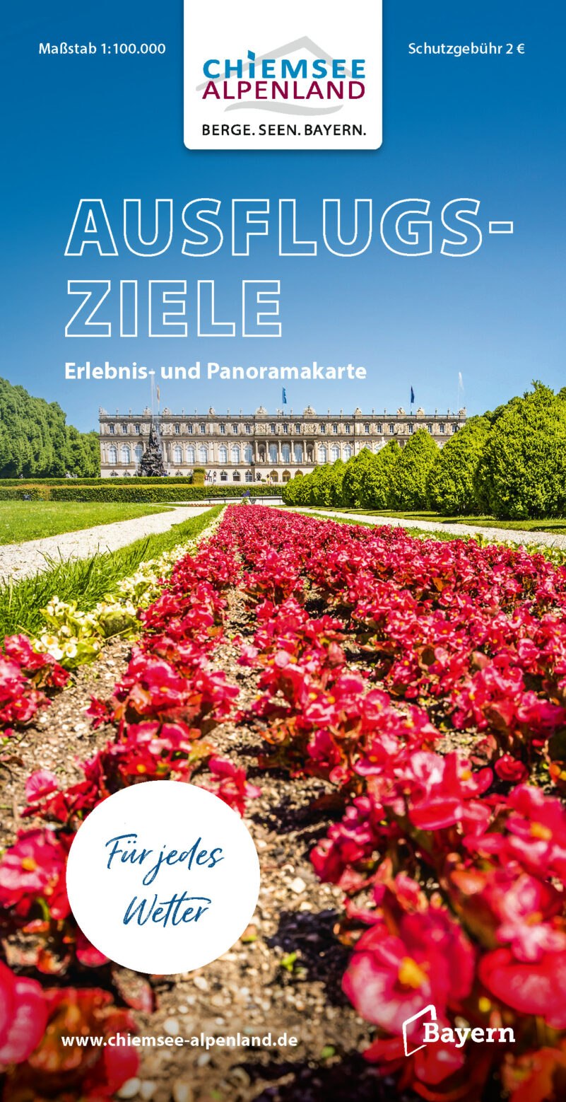 Panoramakarte „Ausflugsziele“ von Chiemsee-Alpenland Tourismus erschienen, die Urlauber und Einheimische bei ihrer Freizeitplanung unterstützen soll. Für einen möglichst abwechslungsreichen Aufenthalt in der Region ist die Ausflugszielekarte ein unersetzlicher Helfer, denn sie umfasst rund 100 unterschiedliche Ziele mit Adresse und Website, die alle in der Karte eingezeichnet sind. Um möglichst schnell die passende Unternehmung für den Tag zu finden, sind die Aktivitäten in verschiedene Kategorien unterteilt. Außerdem verraten nützliche Piktogramme auf den ersten Blick, ob ein Ausflugsziel familienfreundlich, schlechtwetter-tauglich oder barrierefrei ist. Kleine Symbole auf der Karte weisen darüber hinaus auf weitere Freizeiteinrichtungen