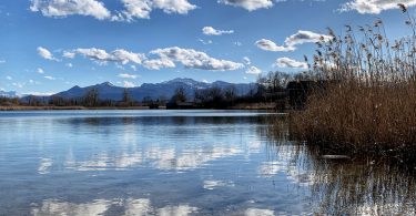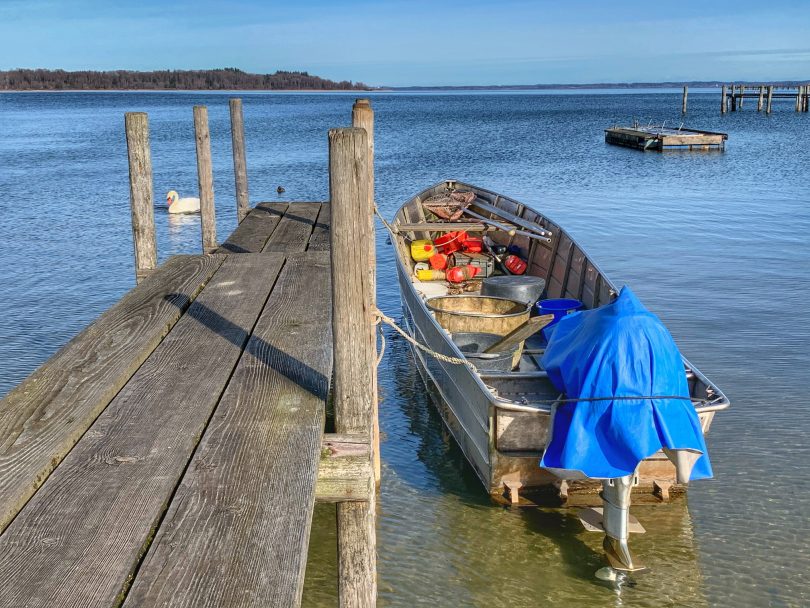 Der wohltuende Sonnenschein um die Mittagszeit lädt zum Schlendern wie hier am Bayerischen Meer, dem Chiemsee, ein. Es scheint als schlummert der See und hat ein Mittagsschläfchen eingelegt. Schick im weißen Federnkleid gehüllt, lässt sich der Schwan vor der Kulisse der Herreninsel gemächlich dahintreiben und genießt ebenso die wohltuende Wetterlage. Einen farbenfrohen Akzent setzt dabei das Fischerboot im Wasser bei Bernau-Felden. Sicher hat dieser Chiemsee-Fischer um diese Tageszeit auch ein Päuschen, denn sein Arbeitseinsatz ist ja bereits zum Morgenerwachen.