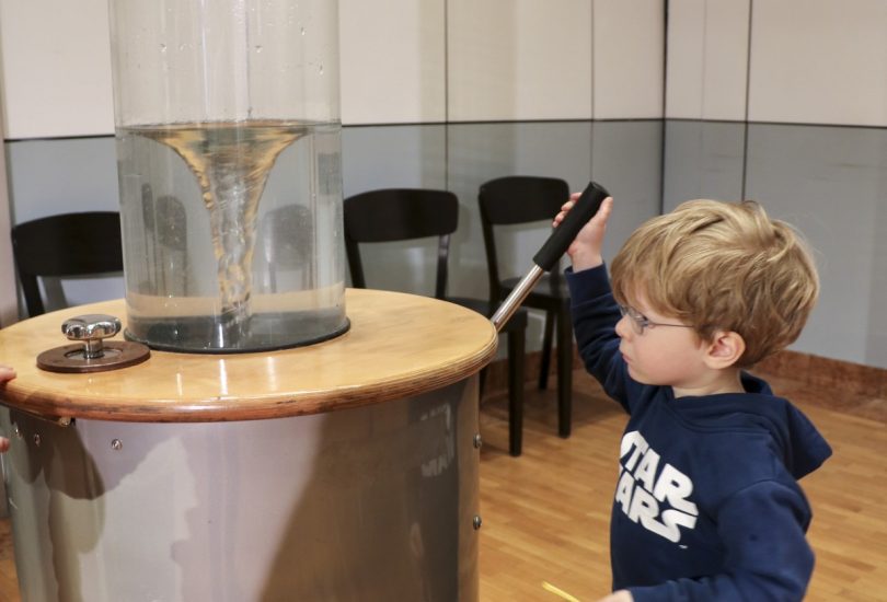 Bildunterschrift: Fasziniert vom Anblick eines Wasserstrudels waren nicht nur die kleinen Ausstellungsbesucher. „Die Spiralbewegung ist eine der Urformen, die die Entwicklungsbewegung des werdenden Lebens ausführen“, erklärt ein Mitarbeiter von Schloß Freudenberg bei einer der offenen Führungen 2017.