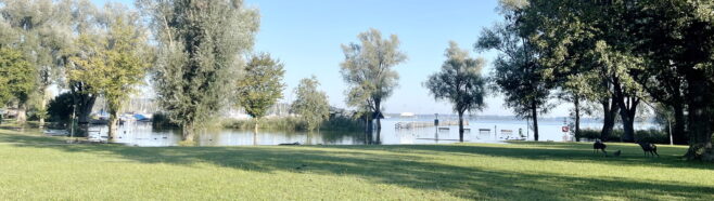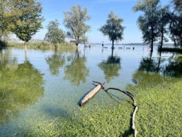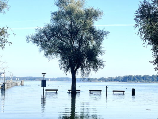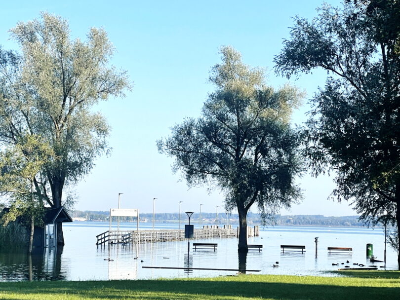 Nur allmählich und langsam zieht sich das Hochwasser von den Chiemsee-Ufern wieder zurück. Einschränkungen im Schiffs- und Radlwege-Verkehr sind noch gegeben.