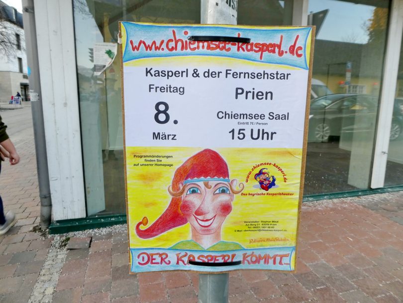 Am Freitag, 8. März gastiert das Team von www.chiemsee-kasperl.de in Prien. Beginn der Aufführung mit dem Titel “Kasperl & der Fernsehstar” ist um 15 Uhr im Chiemsee-Saal im Haus des Gastes. Der Eintritt beträgt je Person sieben Euro.