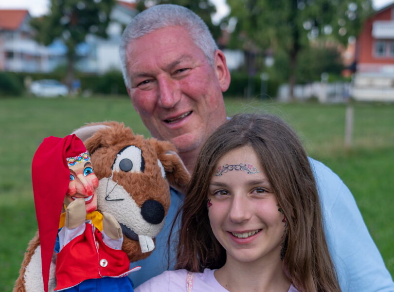 Bericht und Foto: Chiemsee-Kasperl – Die zwölfjährige Denise unterstützt ihren Papa Stephan Mikat beim Chiemsee Kasperltheater. Ihre Lieblingspuppe ist dabei der Hase Mucki, eigentlich im Hauptberuf Osterhase. Weil er aber gerade arbeitslos ist, darf er beim Kasperl aushelfen.