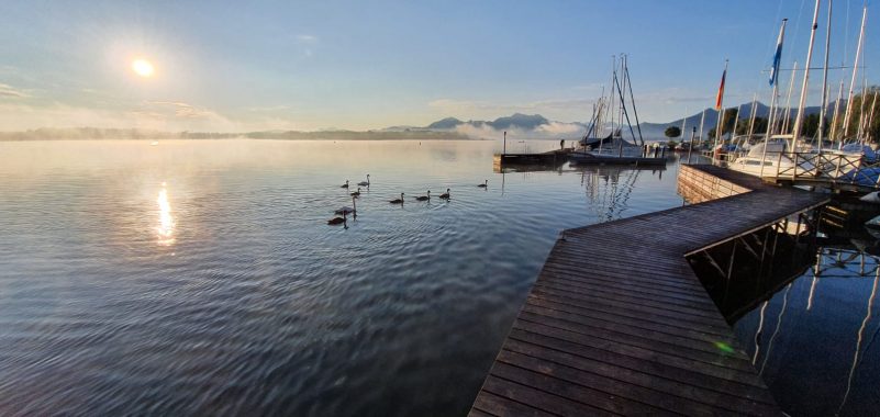 Chiemsee-Morgenstimmung  im Sportboothafen der Stippelwerft