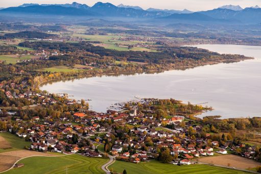 Der Chiemsee hat viele schöne Seiten, ganz besonders reizvoll ist in diesen Tagen mit vielen Herbstfarben und bei klarer Sicht ein Blick aus der Vogelperspektive. Bei einem Rundflug im Chiemgauer Voralpenland entstanden dabei diese Bilder mit Blick über die Chiemsee-Inseln zu den Chiemgauer Bergen und hinab in die Gemeinde Seebruck.