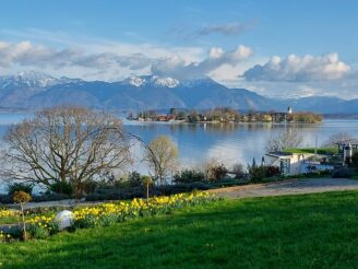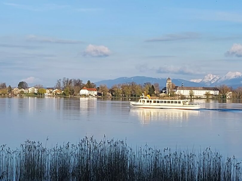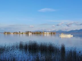 Klare Farben, noch wenig Betrieb auf dem Wasser des Bayerischen Meeres und die Fraueninsel im Abendlicht kennzeichnen diese Aufnahmen vom Dienstagabend.