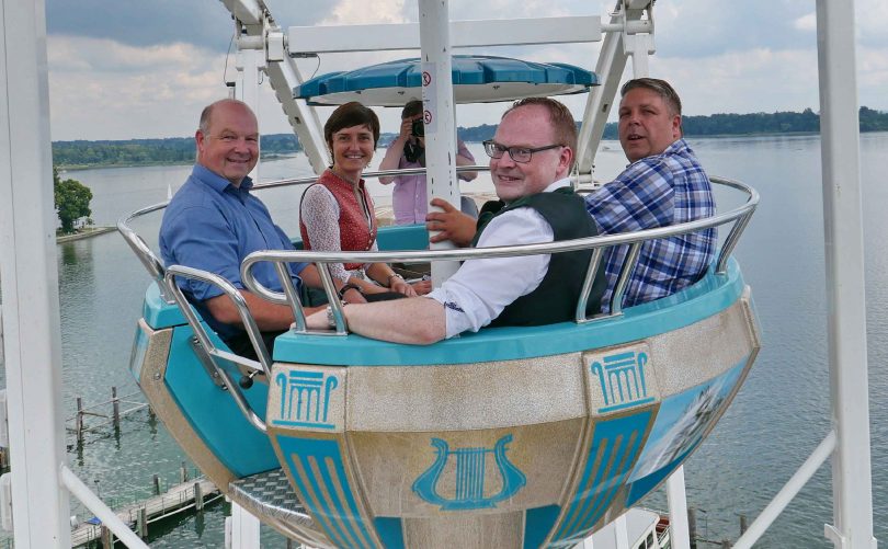 Endlich tun sich wieder Sonne und Freizeit-Unternehmenskraft auf. Da bietet sich gerade das 38 Meter hohe Riesenrad direkt am Chiemsee im Hafen der Chiemsee-Schifffahrt an. Gute Aussichten  gibt es nicht nur für die nächsten Tage mit gutem Wetter, sondern auch hinaus auf den See, hinüber in die Chiemgauer Berger und hinweg über die Marktgemeinde Prien. Das Riesenrad fährt noch bis zum bayerischen Ferienende täglich -ohne Voranmeldung- ab 10 Uhr.