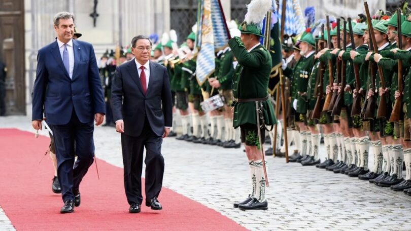 Foto & Text: Bayerische Staatsregierung – Bayerns MP Dr. Markus Söder und Chinas Premierminister Li Qiang beim Abschreiten der Ehrenkompanie der Bayerischen Gebirgsschützen