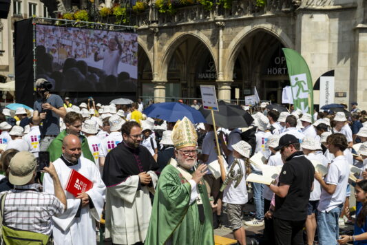 Mit dem Gottesdienst ging das 45. internationale Kinder- und Jugendchorfestival der Pueri Cantores zu Ende, einem internationalen Verband mit rund 1.000 katholischen Kinder- und Jugendchören aus 43 Ländern. 166 Chöre aus 16 Ländern hatten sich unter dem Motto „Cantate Domino – Vielstimmig für den Frieden – #comeandsing“ vom 16. bis 20. Juli in München getroffen. Auf dem Programm standen unter anderem Galakonzerte in Kirchen, ein „Fest der Kulturen“ auf dem Marienplatz, muttersprachliche Gottesdienste, Friedensgebete, Workshops sowie Auftritte in sozialen Einrichtungen der Stadt. (hor)
