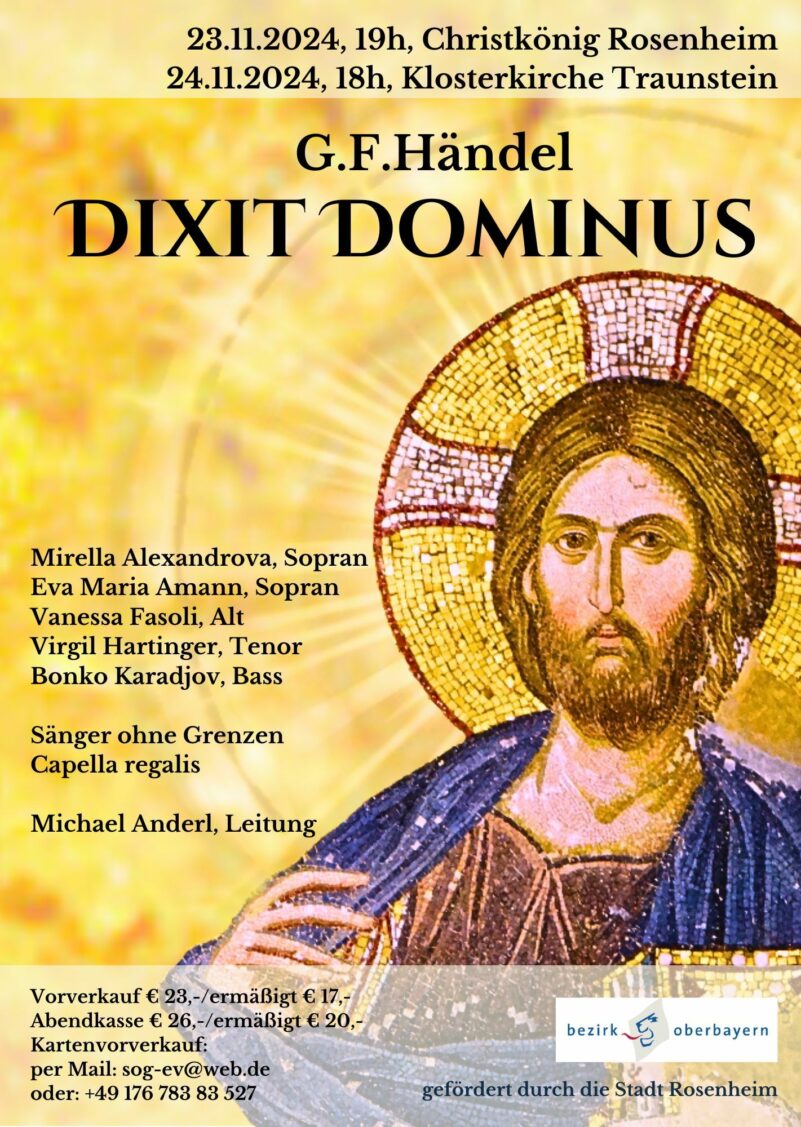 Chorkonzerte mit Werken von G.F. Händel mit dem Titel DIXIT DOMINUS werden am Samstag, 23. November ab 19 Uhr in der Christkönigkirche Rosenheim und am Sonntag, 24. November ab 18 Uhr in der Klosterkirche von Traunstein angeboten.