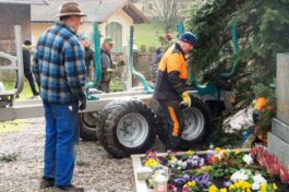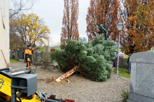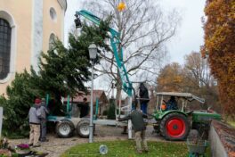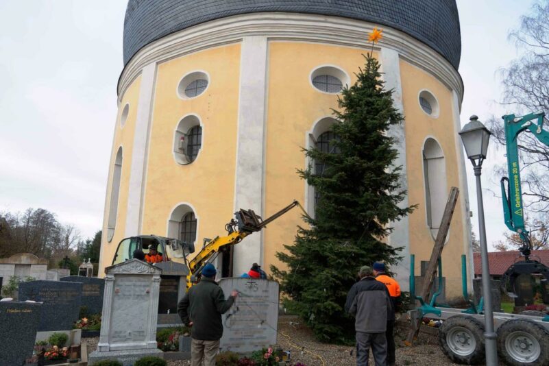 Jetzt war es wieder so weit: Der Christbaum an der Rundkirche St. Johann Baptist und Heilig Kreuz im Rosenheimer Stadtteil Westerndorf am Wasen wurde aufgestellt! Es ist das dritte Jahr, in dem ein Baum den Friedhof ziert – neben den beiden bewährten, geschmückten Bäumen zu Weihnachten am Hochaltar im Inneren der Kirche. Erstmals begonnen damit in der Corona-Zeit, hat sich schon (fast) eine neue Tradition entwickelt.