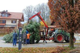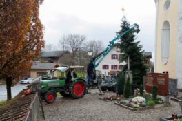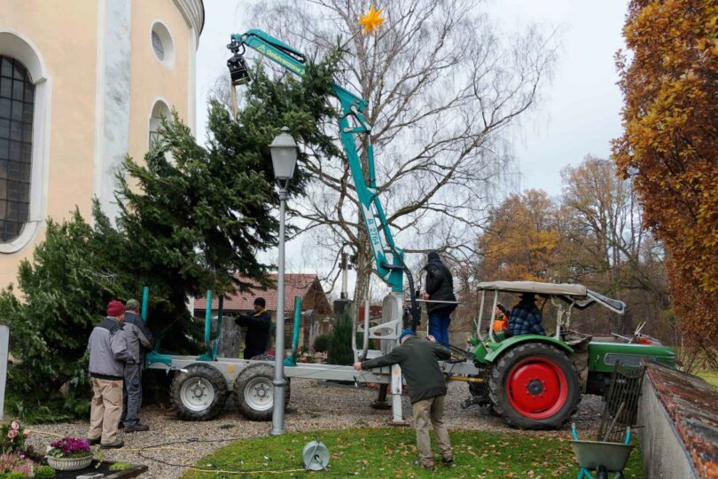 Am Samstag vor dem ersten Advent trafen sich am Vormittag zehn fleißige Helfer, um den in diesem Jahr von Georg Rutz aus Pang gespendeten Baum aufzustellen und mit einem neuen Stern auszustatten. Die Installation der energiearmen Beleuchtung in Form von Lichterketten samt Zeitschaltuhr folgt dann noch am Dienstagvormittag.