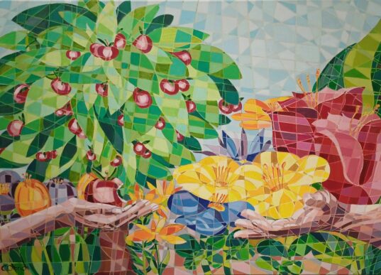 Mit dem Zyklus gibt die Malerin nicht ihre Liebe zu Bayern, sondern auch die Kuh, die ihre verbindende Assoziation mit dem Land ist. Zugleich erweist sie damit Bayerns Bauern ihre Referenz. Gleichermaßen sind die Bilder der Ausstellung stark geprägt von Hinweisen und Bildmaterial aus der Heiligen Schrift, was jeder an symbolträchtigen Zeichen erkennen wird, wie auch aus den zugehörigen Texten. Das farbenprächtige Bild „Äpfel“ wird jeder, der genau hinsieht, als den Baum der Versuchung im Garten Eden erkennen, wo eine ausgestreckte Hand der anderen einen Apfel reicht. Der Bogen ihres Zyklus beginnt also dort, wo die Schöpfung hervorbricht und bald mit dem allseits bekannten Apfel einen Dämpfer erfährt.