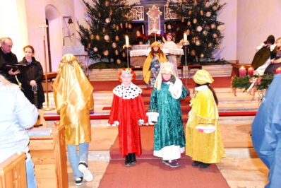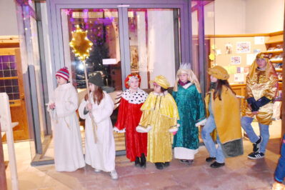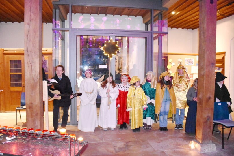 Den Rahmen bildete eine Geschichte von Noah und seinem Opa, der dem Enkel die Geschichte vom Herrnhuter Stern erzählte, vorgelesen von Diakon Michael Soergel und Gemeindereferentin Birgit Steinbacher mit der Gitarre in drei Stationen. Die jungen Darsteller aus der Pfarrei (sie werden auch das Krippenspiel am Heiligen Abend aufführen) folgten als Sterndeuter dem hellen Stern, bis sie zu König Herodes gerufen wurden. Alle Besucher mit ihren Kindern wurden aufgefordert aufzustehen und gemeinsam nach Judäa zu wandern, um die Audienz bei König Herodes zu begleiten, der von dem Gerücht, dass ein neuer König geboren worden sei, gehört hatte. Die dritte Station, die alle Besucher begleiteten, war dann in Bethlehem an der Krippe. Gemeinsam wurde fröhlich gesungen „Zumba Zumba welch ein Singen“ und weitere Weihnachtslieder, Diakon Michael Soergel las Gedanken und Gebete über das Licht vor, die auf das bevorstehende Fest vorbereiteten. Ein stimmungsvoller Abschluss entstand durch das gemeinsam gesungene Lied „Ihr Kinderlein kommet…“, das mit dem Trompetenspiel von Benjamin Kirsch wunderbar begleitet wurde. Nach der diesmal etwas anderen aber sehr berührenden Christkindlsuche konnten alle Besucher den heißen Kinderpunsch genießen.