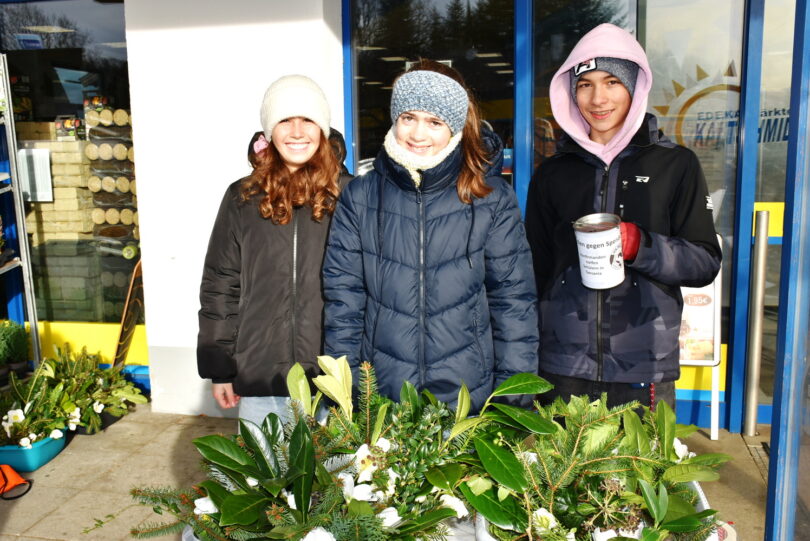 Das Tansania-Team und die Konfirmanden der Evangelischen Kirchengemeinde Marquartstein haben am Vorabend der „Christrosen Aktion“ zusammengesessen und fleißig wunderschöne Sträußchen mit Tannengrün, Beeren, Efeu und Christrosen gebunden. Die wurden dann am nächsten Tag vor verschiedenen Supermärkten in Marquartstein, Grassau und Unterwössen auf einem Tisch ausgelegt und gegen eine Spende abgegeben. In Marquartstein standen drei Konfirmanden (Foto), die den Besuchern erklärten, was es mit der Christrosen-Aktion auf sich hat.