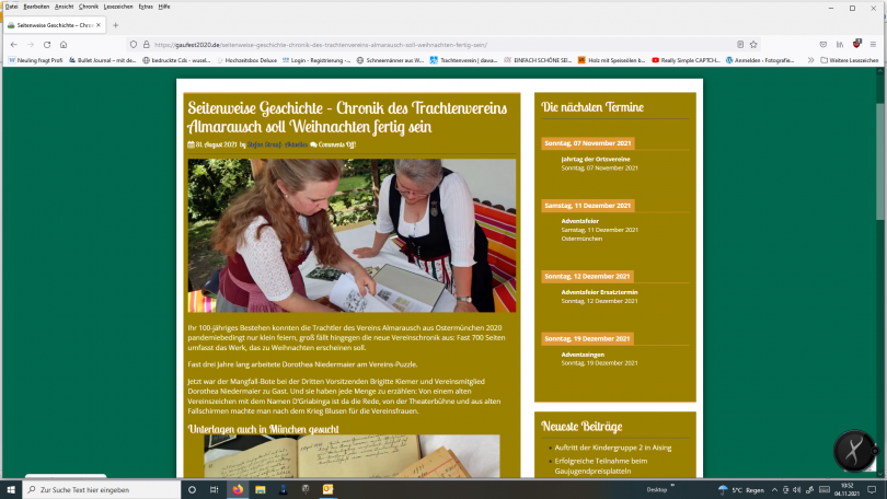 Auf 100 Jahre kann der Trachtenverein Almarausch Ostermünchen zurückblicken. Das Jubiläum mit Gaufest 2020 musste pandemiebedingt abgesagt werden, umso größer ist jetzt die Freude, dass die 700 Seiten starke und reichlich bebilderte Chronik zum Jubiläum rechtzeitig auf Weihnachten fertig wird. Vorbestellungen sind ab sofort möglich entweder über Dorothea Niedermaier, Tel. 08067-672 (d.niedermaier@gmx.de), über Dritte Vorständin Brigitte Kiemer oder über die Internetseite des Vereins www.gaufest2020.de.