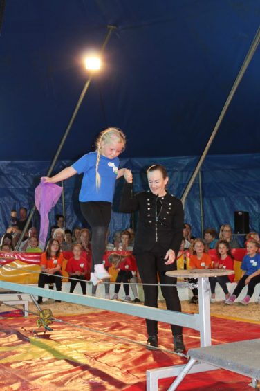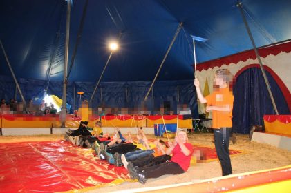 Aufgrund der gesehenen Eindrücke und eigenen Wünsche konnte sich dann jede Schülerin und jeder Schüler seine artistische Disziplin aussuchen und mit dem Training beginnen. Bodenakrobatik, Seiltanz, Kunststücke am Schwebebalken, Jonglage und Hula Hoop waren neben der Ausbildung zum Clown nun die Hauptinhalte der Unterrichtsstunden. Die erlernten Kunststücke zeigten die Jung-Artisten in einer Generalprobe den Schülern aller Priener Grundschul-Klassen. Am nachmittag kamen dann Eltern und Geschwister, um das Erlernte unter der Zirkuskuppel zu bestaunen und verdienten Applaus zu spenden. Die Lehrer der Schule bedankten sich anschließend herzlich bei den Mitgliedern der Familie Frank vom Circus Boldini, die sich täglich pädogogisch versiert der Schulkinder angenommen hatte. Dankesworte galten außerdem dem Förderverein und dem Elternbeirat der Priener Grundschule, welche das Projekt finanziell unterstützt hatten. Einen besonderen Dank richteten Lehrer und Zirkusfamilie an die Landwirtsfamilie Bohrer, die ihre Grundstücke neben dem Sportplatz der Schule sehr kurzfristig und kostenlos zur Verfügung gestellt hatten. Mit einem Schulfest der Schulgemeinschaft Wildenwart und mit Auftritten der Bläserklasse unter der Leitung von Josef Steiner klang die außergewöhnliche Unterrichtswoche in Wildenwart aus. Lehrer und Eltern waren sich abschließen einig, dass dieses Schul-Erlebnis auch in vier Jahren wieder in Wildenwart verwirklicht werden soll, denn – so Sonja Hinterleitner vom Schulleitungsteam: “Das Miteinander, die Klassenmischung, das Vertrauen, das Selbstbewußtsein und die soziale Kompetenz – all das wurde mit dieser Woche gefördert” – (über die von der Schule mit-initiierte Spenden-Aktion für die von einem Unglück betroffene Artistenfamilie berichten wir noch gesondert).