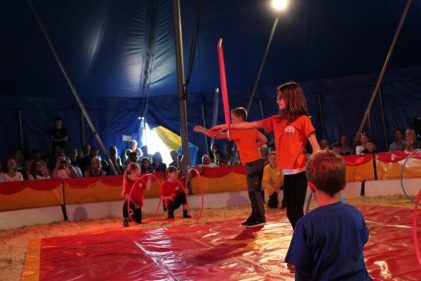 Vor vier Jahren war erstmals der Circus Boldini für eine ganze Schul- und Aktionswoche zu Gast in Wildenwart. In Abwechslung mit einer Buch-Woche kam es nun vor Pfingsten zu einem zweiten Mal, dass sich die 87 Dirndl und Buam der vier Klassen der Außenstelle der Grundschule Prien in Wildenwart auf eine spannende und erfahrungsreiche Woche machten durften. „Hereinspaziert“ – so hieß es am ersten Tag von der Circus-Familie Frank, die sich mit einem grandiosen und einstündigen Ausschnitt aus dem aktuellen Circus-Programm vorstellte.