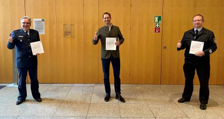 Foto: Stadt Rosenheim; vlnr: Polizeipräsident Robert Kopp, Oberbürgermeister Andreas März, Hans Meyrl, Leiter Amt für Brand- und Katastrophenschut