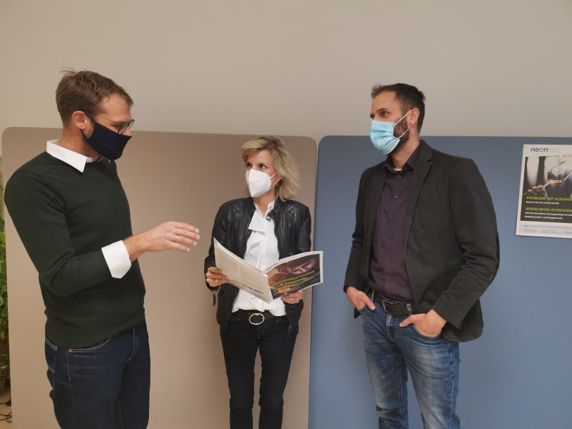 Foto: Die Drogenbeauftragte der Bundesregierung, MdB Daniela Ludwig im Gespräch mit den Neon-Geschäftsführern Ludwig Binder (links) und Benjamin Grünbichler.