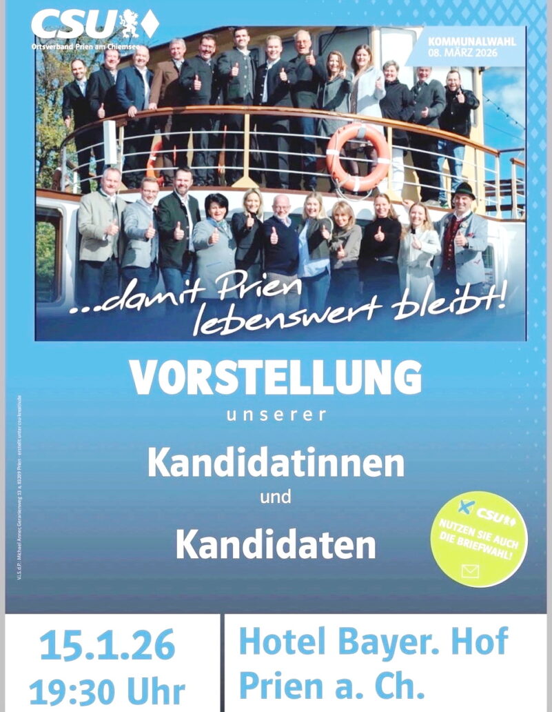 Der CSU-Ortsverband Prien a. Chiemsee lädt im Rahmen der heurigen Kommunalwahlen zur Vorstellung seiner Kandidaten unter dem Motto “Damit Prien lebenswert bleibt!” ein.