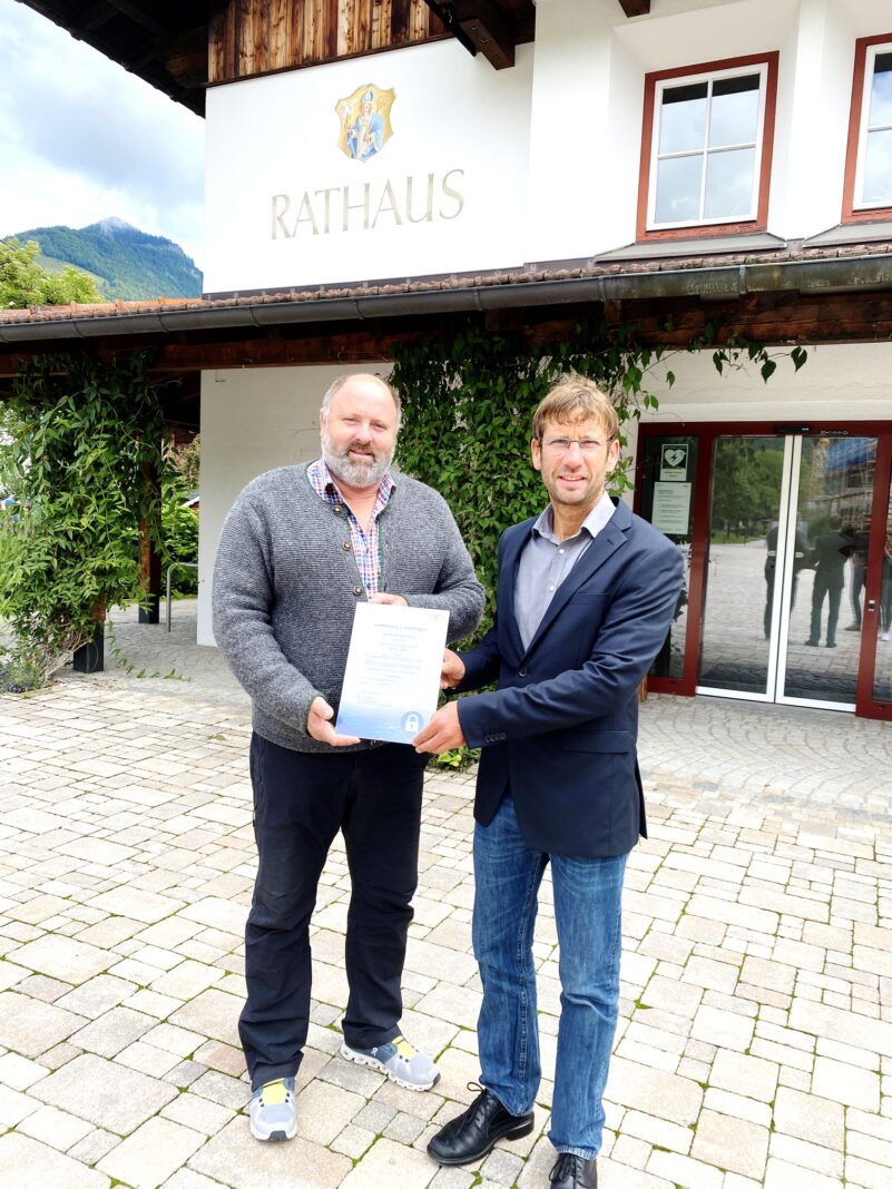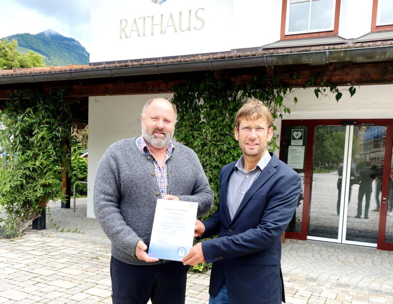 Die Übergabe erfolgte an den Bürgermeister der Gemeinde Schleching, Josef Loferer durch den Informationssicherheitsbeauftragten im Landkreis Traunstein, Claus Hofmann. wun/ISB