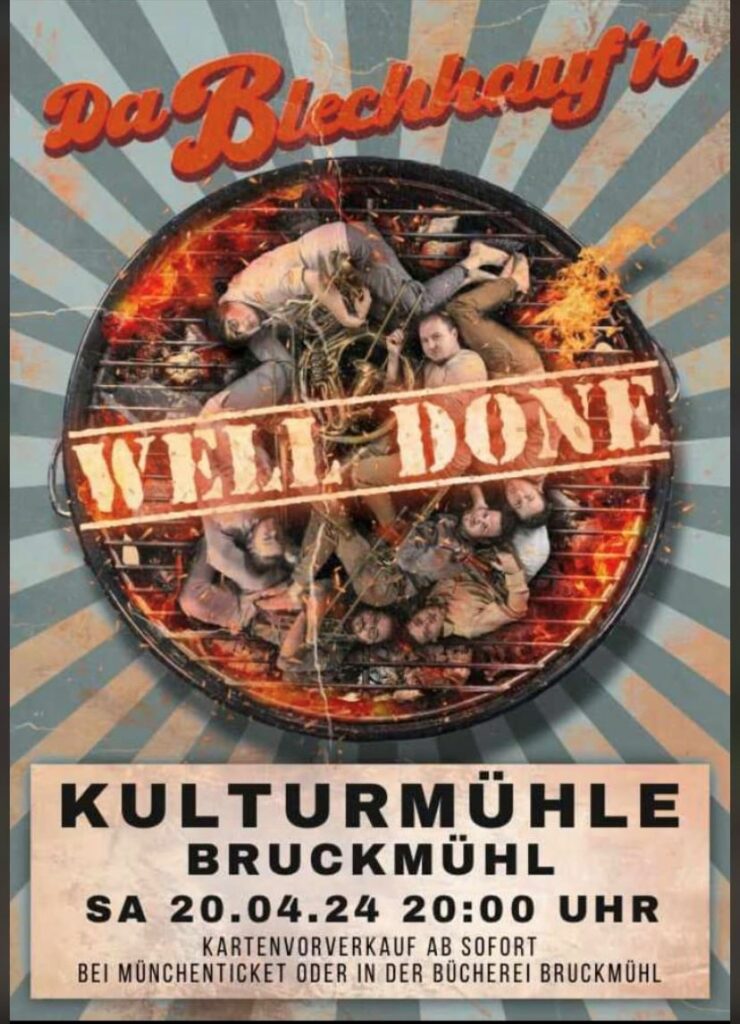 Die 7 mittlerweile etwas angebratenen Herren vom „Da Blechhauf’n“ kredenzen Ihnen mit ihrem neuen Programm „Well Done“ gutbürgerliche Polkas, poppiges Fastfood, schmalzige Balladen, würzigen Bauernjazz, saftige Märsche, verkohlte Klassik, süß-sauren Blues und goldbraun panierte Walzer. Damit Ihnen Kehle und Augen nicht trocken bleiben, wird dazwischen gehörig eingeschenkt. Viele Köche verderben vielleicht den Brei, aber sicher nicht diesen Abend. Prost Mahlzeit!