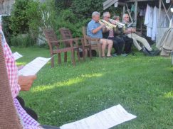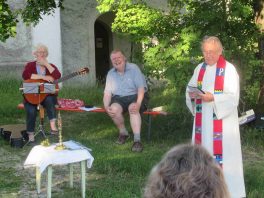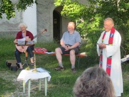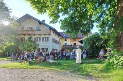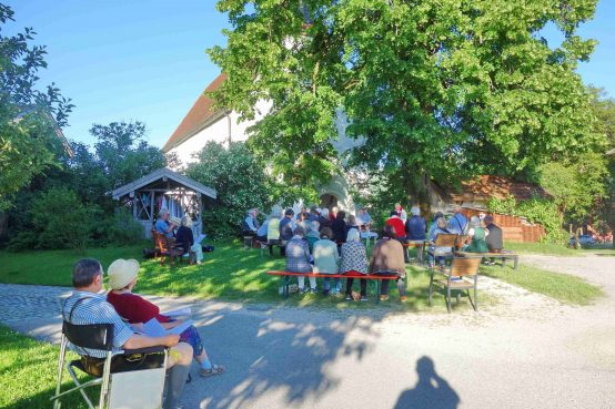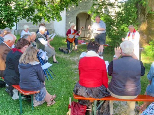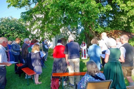 Auf Initiative von Ernst Schusser, dem langjährigen und vormaligen Leiter des Volksmusikarchivs des Bezirks Oberbayern in Bruckmühl kam es heuer zum zweiten Male zu einer Andacht beim Kirchlein in Höhenberg bei Aschau i. Chiemgau. Kurzfristig wurde –nachdem es coronabedingt wieder möglich war – ein Zusammenkommen unter der Linde und unter freiem Himmel mit Aschaus vormaligem Pfarrer Josef Winkler ausgemacht. Für die musikalische Gestaltung sorgten das Bläser-Duo Gawlik-Bauer, Eva Bruckner an der Gitarre und –endlich wieder- die Gläubigen mit Gesang und ausgeteilten Líedtexten. Die Gebetsworte von Pfarrer Winkler richteten sich an die schützenswerte Heimat und Schöpfung. Eingehend auf die aktuelle Zeit der Corona-Lockerungen zitierte der Geistliche folgendes bengalisches Sprichwort: „Dumme rennen, Kluge warten und Weise gehen in den Garten“. Ein besonderer Dank galt der Bauersfamilie Aringer für deren Unterstützung der Andacht.