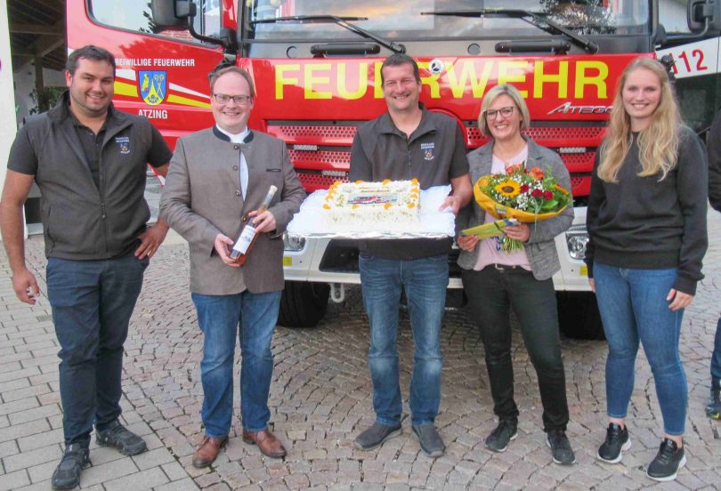 Doppelte Freuden und auch vielfache Gründe zum Danken gab es bei der Feuerwehr in Prien-Atzing. Just am Tag als Rosi Huber, Ehefrau des Ersten Kommandanten der Atzinger Feuerwehr ihren 40. Geburtstag feiern konnte, galt es für ihren Mann Paul das neue Feuerwehrfahrzeug LF 20 Kat S in der Nähe von Linz abzuholen. Getan und Geburtstagsfeier daheim verschoben ging alles seinen Weg. Als nunmehr das 420.000 Euro wertvolle Feuerwehrfahrzeug in Atzing ankam (wir berichteten), da freute sich natürlich auch Rosi Huber. Und besonders überrascht wurde sie mit ihrem Mann auch noch: stellvertretender Kommandant Bernhard Summerer und Anna Boggusch als Leiterin der Jugendfeuerwehr überbrachten vor versammelter Aktiven-Mannschaft nicht nur herzliche Geburtstagswünsche und Blumen für Rosi, sondern auch noch eine von Christiane Huber gefertigte Torte mit dem neuen Feuerwehrauto-Motiv. „Damit wollen wir Dir, Paul und Dir Rosi für all Eure Bemühungen und für all Euer Verständnis danken, denn es war nicht leicht, dass wir nach zwei Jahren der Überlegungen und Planungen ein so wichtiges und neues Löschfahrzeug bekommen“ – so Anna Boggusch und Bernhard Summerer gemeinsam. Die gesamte Aktiven-Mannschaft überreichte noch einen Gutschein für einen Erholungstag in der Therme Erding. Priens Bürgermeister Andreas Friedrich schloss sich den Glückwünschen und dem Dank mit der Überreichung eines Hochalmgold-Flascherls als persönlichen Präsent an. „Wenn wir wieder normal und mehrfach zusammenkommen können, dann feiern wir Auto und Geburtstag nach!“ – so der sichtlich überraschte Kommandant Paul Huber.