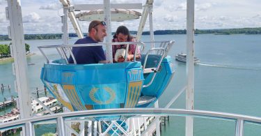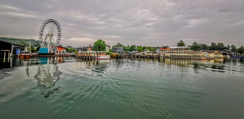 Von weitem ins Auge sticht ab heute das Riesenrad im Hafen der Chiemsee-Schifffahrt von Prien-Stock. Besonders ungewöhnlich ist der Blick vom See auf den Hafen mit der bis zum Herbst optisch dominierenden Freizeit-Einrichtung.