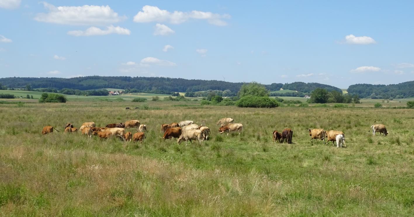Der Weidebetrieb – hier als Mutterkuhherde (Langen Weiher/Baierner Flecken) ist einigen Landwirten noch bekannte Nutzung – Blick vom Damm des Wasserrückhaltebeckens nach Westen. Auf wieder vernässten Moorwiesen ist bei einer ganzjährigen Beweidung sind deutlich weniger als eine „Großvieheinheit“ (500 kg) je Hektar anzusetzen