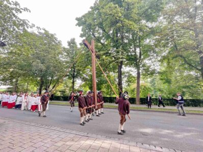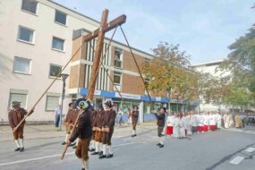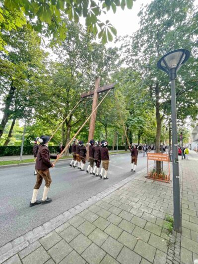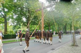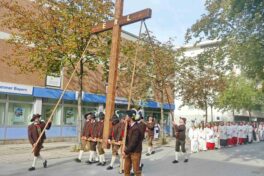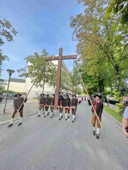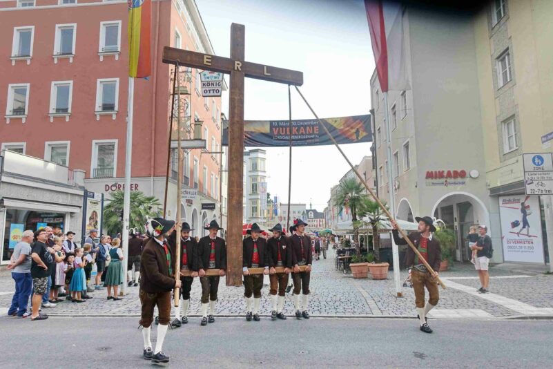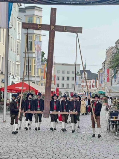 Ein zentrales Motiv im doppelten Sinne von Größe und Botschaft ist beim traditionellen Erntedankfest zum Rosenheimer Herbstfest das Erler Kreuz. Fünfeinhalb Meter hoch (im übrigen einmal etwas verkürzt wegen der Transport-Maße) und rund 160 Kilogramm schwer ist das von 10 gestandenen und starken Männern getragene Glaubenszeugnis. Sechs Männer trugen und vier Männer stützten und steuerten das schwere Kreuz auf seinem Weg vom Max-Josefs-Platz zum Altar am Mangfall-Park.