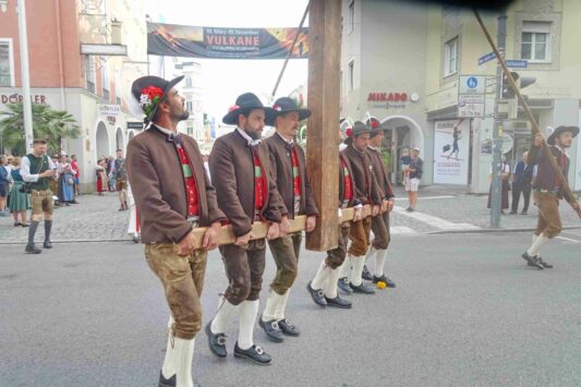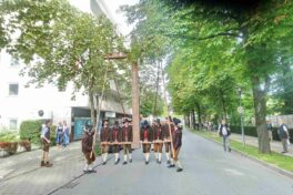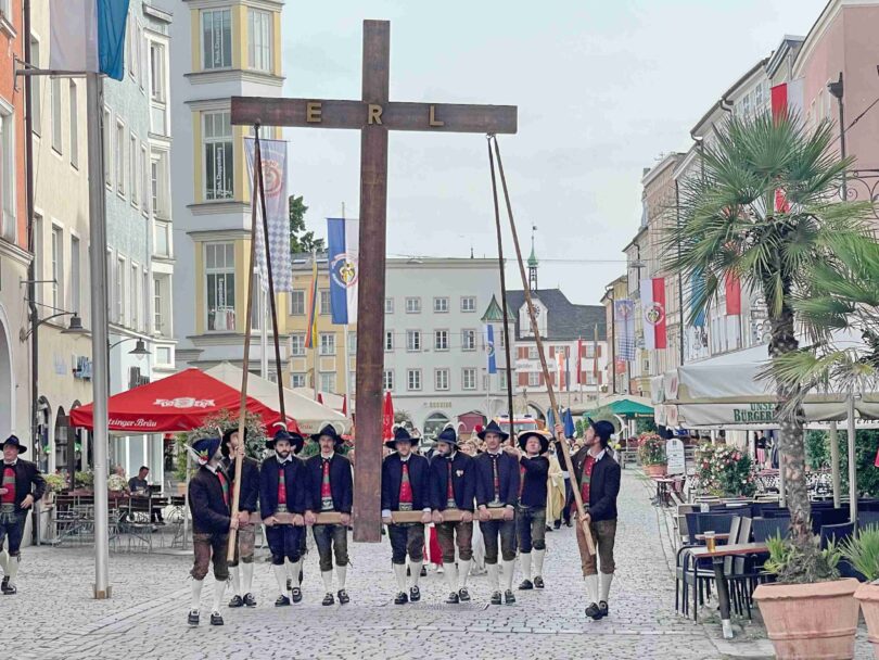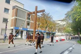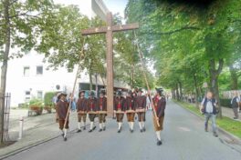 „Das Erler Kreuz entstand in den 50er Jahren anlässlich einer Bischofsweihe in Salzburg als Geschenk der Erler Passionsspiele. Anfangs wurde es von Männern des Chores getragen, seit 2002 nehmen es Mitglieder des Trachtenvereins D´Kranzhorner Erl in die Hände“ – so Obmann Johannes Bachmann, der selbst mit anpackte beim Tragen. Das Erler Kreuz – so der Trachtenvereinsvorsitzende weiter – kommt nur selten zum Einsatz, in der Regel bei besonderen örtlichen und kirchlichen Anlässen, zuletzt auswärts beim bekannten und großen Gauda-Fest im Zillertal und demnächst am Samstag, 23. September wieder dahiem beim Erntedankfest in Erl. „Die Teilnahme am Rosenheimer Erntedankfest ist eine Ehrensache, nach dem Festzug freuen wir uns schon auf eine gemütliche Brotzeit, auf ein gutes Bier und auf die Blasmusik, das haben wir uns dann ja auch verdient“ – so die Erler unisono nach dem Verstauen des Kreuzes und nach ihrer Platzeinnahme auf der Wiesn.