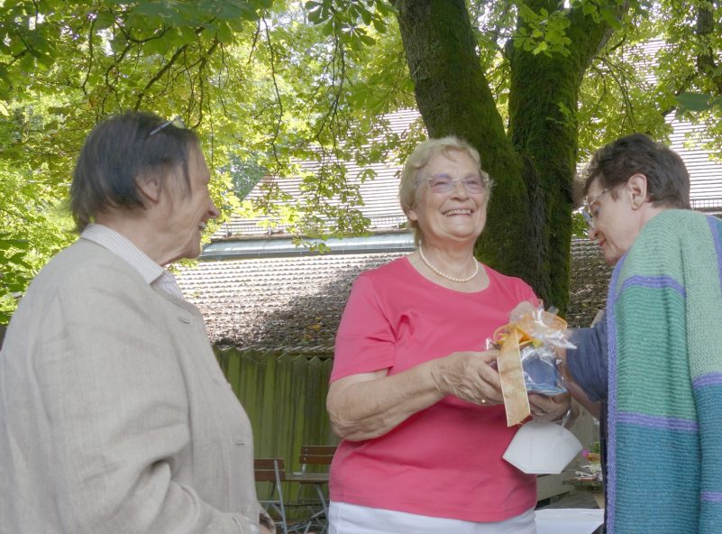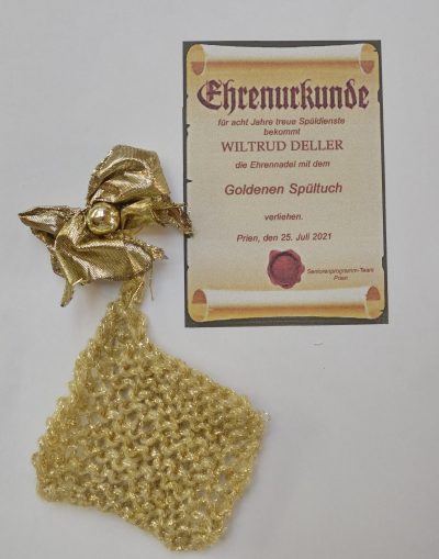 Seit vielen Jahren gibt es in der Marktgemeinde Prien ein Seniorenprogramm, das in guter Abstimmung mit Gemeinde und Rathaus ehrenamtlich geprägt ist. Auch wenn in den letzten beiden Corona-Jahren nicht alle Zusammenkünfte möglich waren, so gab es doch immer wieder Möglichkeiten, die Verbindungen untereinander aufrecht zu erhalten. Um bei den Zusammenkünften herrichten, bewirten und aufräumen zu können, da bedarf es Leuten, die Hand anlegen. Zum Beispiel beim Abspülen. Deshalb gab es bei einer der Gelegenheiten Wiltrud Deller eine Ehrenurkunde für acht Jahre Spüldienste mitsamt einer einzigartigen Ehrennadel mit dem von Helga Stampfl entworfenen Goldenen Spültuch zu verleihen. Die Verleihung nahmen Helga Stampfl (re.) und Renate Schuderer vor.